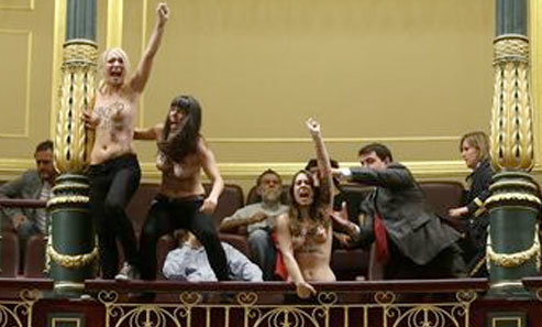 Tres activistas de la organización feminista Femen, desnudas de cintura para arriba, han irrumpido el Pleno del Congreso gritando desde la tribuna de invitados "Aborto es sagrado", lo que obligó a parar la sesión mientras el presidente de la Cámara, Jesús Posada, ordenaba su desalojo.