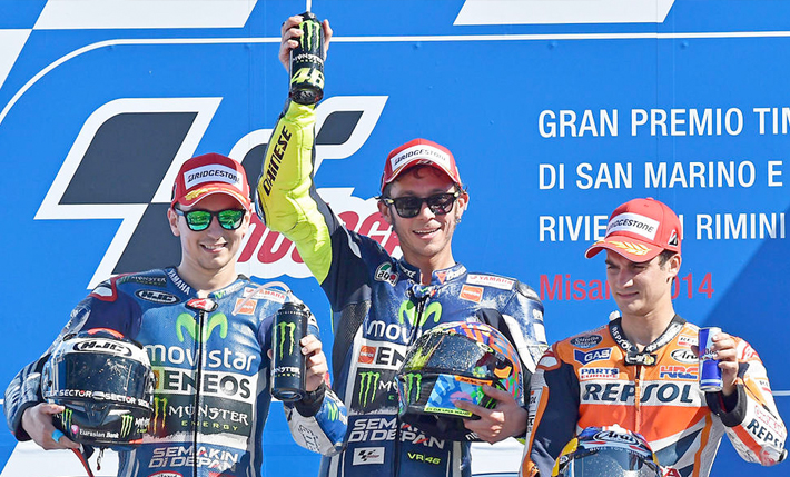 El italiano Valentino Rossi (Yamaha) ha hecho historia al convertirse en el primer piloto de MotoGP en superar los 5.000 puntos en la categoría, tras lograr la victoria en su 'casa', en el Gran Premio de San Marino, por delante de los españoles Jorge Lorenzo (Yamaha) y Dani Pedrosa (Repsol Honda), en una carrera en la que el líder del Mundial, Marc Márquez (Repsol Honda), sufrió una caída que le impidió luchar por el triunfo y le permitió sumar sólo un punto.