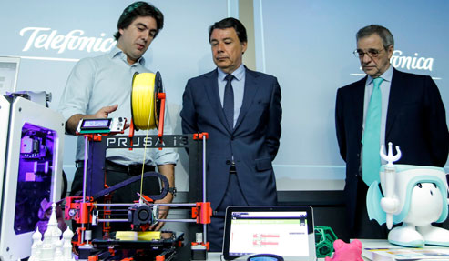 El presidente de la Comunidad de Madrid, Ignacio González, acompañado por la consejera de Educación, Juventud y Deporte, Lucía Figar, junto al presidente de Telefónica, César Alierta, ha visitado este martes la sede de esta empresa y dio a conocer los detalles de este ambicioso programa de formación, que comenzará a funcionar en el mes de octubre.