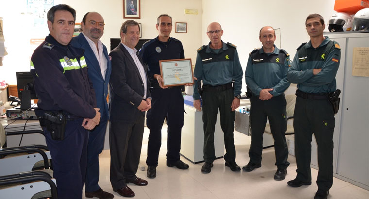 El cabo de la Policía Local Pascual Zaballos Vicente ha sido galardonado por la Comandancia de la Guardia Civil de Madrid en “reconocimiento a su trayectoria de colaboración con el Cuerpo de la Guardia Civil, en beneficio del servicio a los ciudadanos”. El agente local ha recibido la distinción de manos del brigada comandante de puesto de la Guardia Civil en el municipio, Sebastián Checa García, quien ha destacado la labor de Pascual Zaballos así como la importancia de la colaboración entre la Guardia Civil y la Policía Local.
