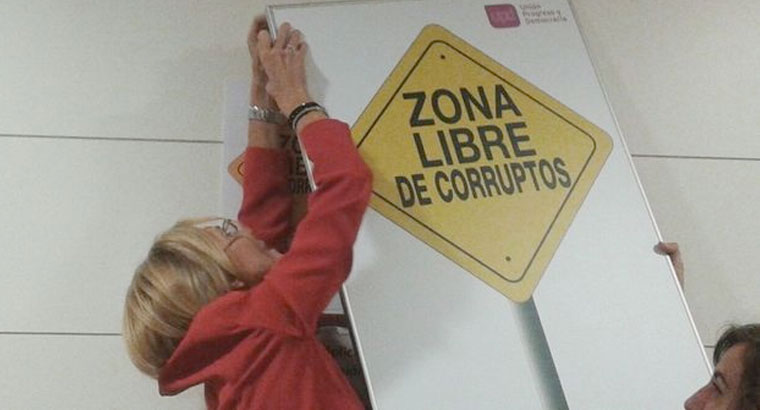 Unión, Progreso y Democracia (UPyD) ha desafiado al presidente del Congreso, Jesús Posada, volviendo a colgar el cartel con la leyenda 'Zona libre de corruptos' en sus dependencias de la Cámara Baja pese a que éste les había ordenado retirarlo por resultar ofensivo para el resto de grupos.