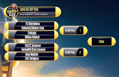 Real Madrid-CAI Zaragoza, FC Barcelona-Valencia Basket, Unicaja-Bilbao Basket y FIATC Joventut-Herbalife Gran Canaria son los emparejamientos de la Copa del Rey de baloncesto, que se disputará en Las Palmas de Gran Canaria entre el 19 y 22 de febrero.