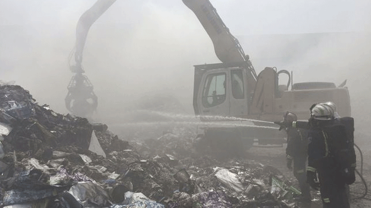 Efectivos de bomberos de la Comunidad continúan trabajando este viernes para sofocar el incendio desatado ayer en la planta de reciclaje del municipio de Arganda, que ya se encuentra controlado.
