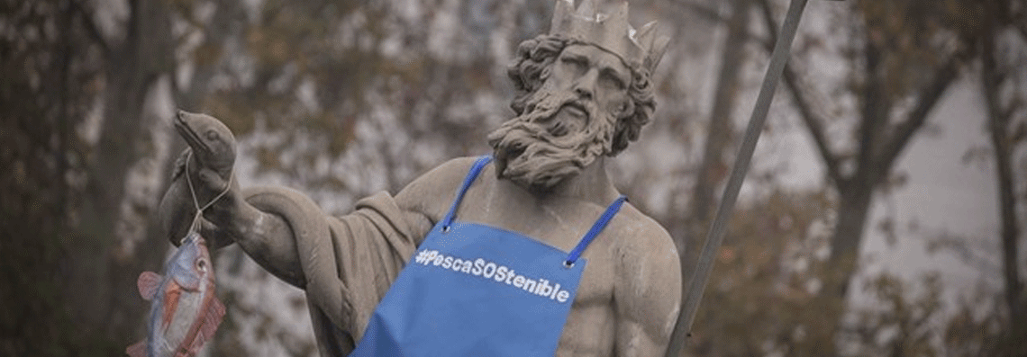 Con delantal de pescadero y con un pez de tela la estatua del conocido dios Neptuno en Madrid, Neptuno exige al Gobierno de España que impulse el correcto etiquetado de los pescados en los puntos de venta. Los activistas han portado una pancarta que pretendía dar voz al dios de los mares, con el mensaje: "¡Etiquetad mis pescados!", y en el delantal podía leerse: #PescaSOStenible.