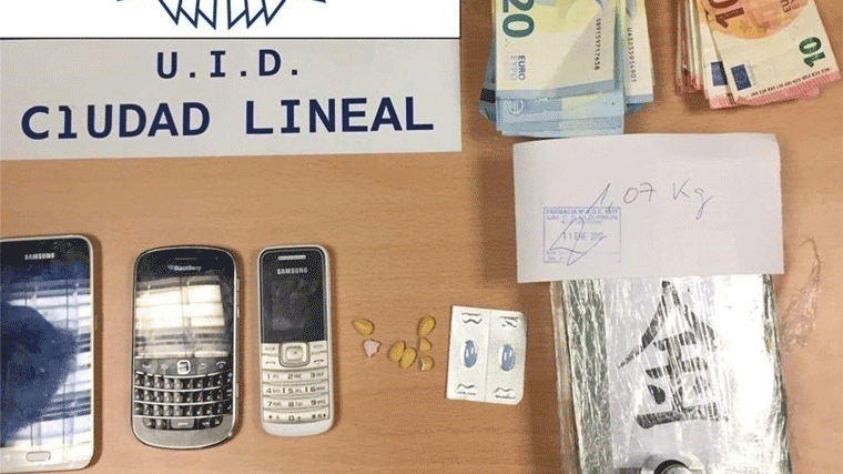 Además del paquete de un kilogramo de cocaína, del dinero y los móviles, se incautaron en el registro una balanza de pesaje y diversas pastillas.