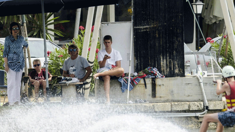 Irene Urdangarín no se animó con este deporte y esperó sentada junto a su abuela viendo las habilidades de su hermano y su primo. Lo mismo hizo su hermano mayor Juan Valentín, quien prefirió entretenerse con el móvil y disfrutar desde la orilla Miguel llevaba el brazo izquierdo vendado por lo que no pudo unirse al grupo pero intentó navegar con una tabla y así poder refrescarse.