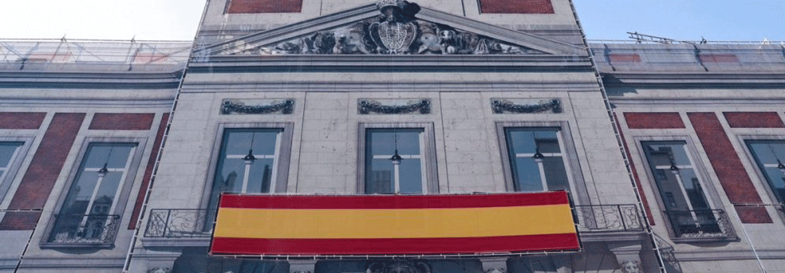 Como la fachada de este edificio, en la Puerta del Sol, está en obras, se ha procedido a colocar la bandera en la lona que protege el inmueble y que ocupa los balcones centrales en la fachada principal.