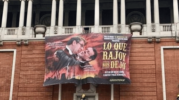 La ONG ambientalista Greenpeace ha desplegado este viernes en el antiguo Palacio de la Música de Gran Vía una pancarta en la que parodian al presidente del Gobierno, Mariano Rajoy, y al ministro de Energía, Turismo y Agenda Digital, Álvaro Nadal, como los protagonistas de 'Lo que el viento se llevó' para criticar su "impuesto al sol" y la inacción ante el cambio climático.