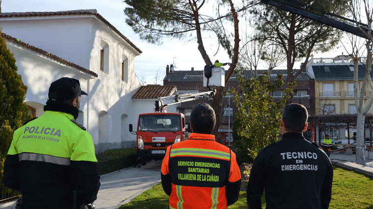 El Ayuntamiento de Villanueva de la Cañada ha llevado a cabo la tala los dos pinos piñoneros ubicados junto a la Casa Consistorial, en la plaza de España. Ambos ejemplares, con 35 años de antigüedad y más de 15 metros de altura, habían resultado dañados por los fuertes vientos provocados por la ciclogénesis Hugo este pasado sábado. Desde ese día, el consistorio había acordonado la zona para prevenir accidentes.