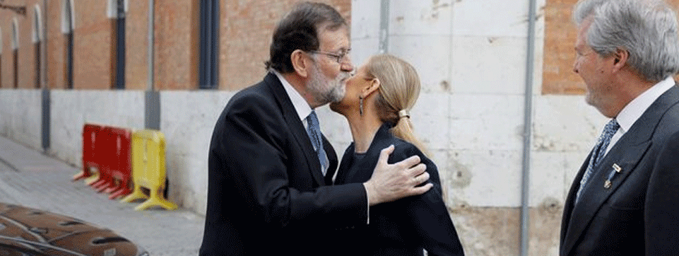 El presidente del Gobierno, Mariano Rajoy, y la presidenta de la Comunidad de Madrid, Cristina Cifuentes, se han saludado de forma protocolaria este lunes en la concesión del Premio de Cervantes, primer encuentro público entre ambos desde hace quince días, cuando coincidieron en la Convención Nacional del PP en Sevilla ya con el caso del máster en auge.