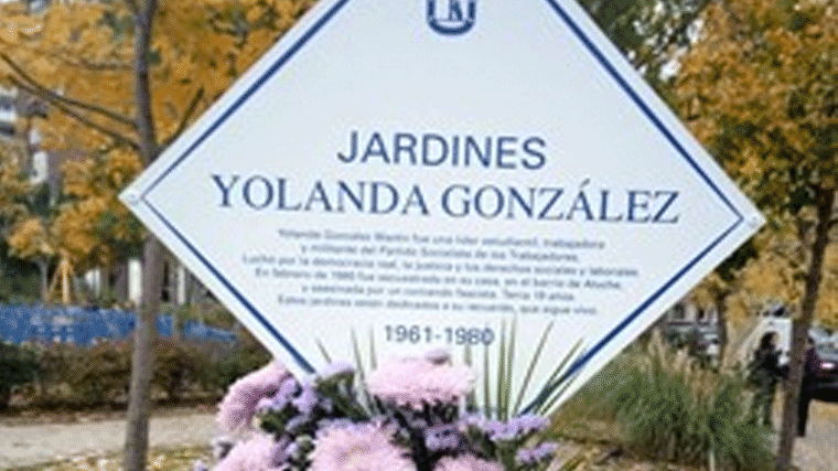 Este mismo domingo, el concejal Carlos Sánchez Mato descubría una placa que recuerda a la líder estudiantil Yolanda González en los jardines con su nombre, en Aluche, 38 años después de su asesinato por la ultraderecha.