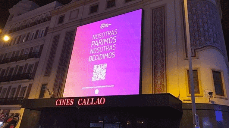 La asociación de familias por gestación subrogada Son Nuestros Hijos ha pegado carteles en el centro de Madrid y Barcelona que llevan rotulado el lema 'Nosotras parimos nosotras decidimos'. Concretamente, las pantallas de la plaza madrileña de Callao se han iluminado con esta frase pasadas las 23.00 horas.