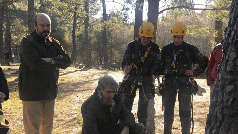 El dirigente madrileño ha visitado las dos nuevas plataformas artificiales para el anidamiento de buitres negros, que han sido emplazadas por el Grupo de Intervención en Altura del Cuerpo de Agentes Forestales de la Comunidad, ya que requieren "una exhaustiva formación práctica y enorme destreza debido a que los agentes trabajan suspendidos en árboles de grandes dimensiones".