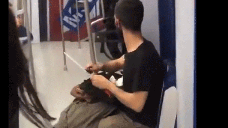 Se tratan de unas imágenes grabadas por un usuario en un tren en la línea 10 de Metro y que ha adelantado Telemadrid. Un joven con pantalón verde y camisa negra aparece sentado en uno de los asientos del vagón solo y afilando un cuchillo