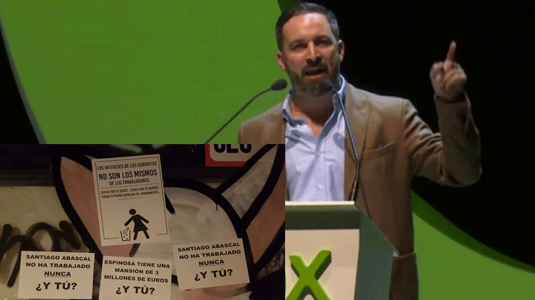 Carabanchel ha amanecido este viernes con carteles contra el acto que Vox celebrará este domingo en el Palacio de Vistalegre con lemas como 'Santiago Abascal no ha trabajado nunca. ¿Y tú?' o 'Espinosa tiene una mansión de tres millones de euros. ¿Y tú?'.