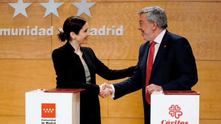 El acuerdo lo han rubricado este martes la presidenta autonómica, Isabel Díaz Ayuso, y el director de Cáritas Diocesana, Luis Hernández, en la Real Casa de Correos, sede del Gobierno regional. En el acto también ha estado presente el consejero de Vivienda y Administración Local, David Pérez.