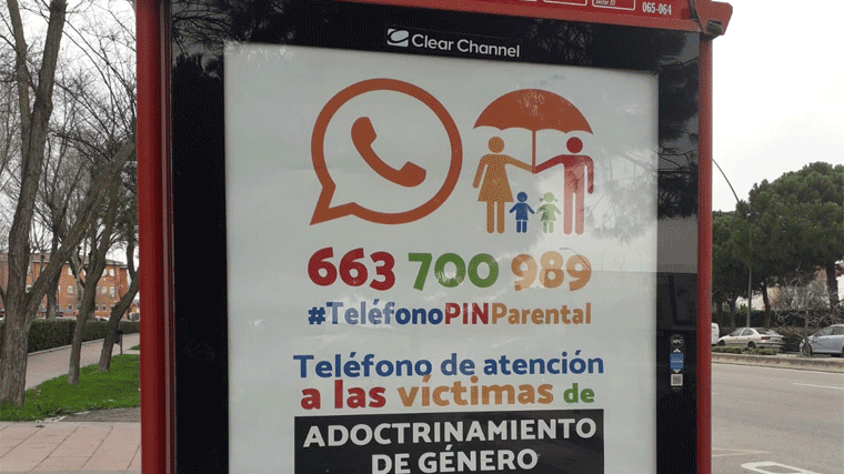 A los continuos requerimientos de Monasterio al Gobierno regional sobre el pin parental y los enfrentamientos de Ortega Smith con el alcalde José Luis Martínez Almedida cada vez que se produce una concentración de los concejales por el asesinato de una mujer, se une ahora la campaña de Hazte Oír, una organización que apoya a Vox, en muchas localidades de la región con reparto de octavillas en las puertas de los colegios y ahora, en Getafe, con la colocación de anuncios en las marquesinas de los autobuses en el que se ve a una pareja sosteniendo un paraguas para resguardar a sus hijos y un teléfono “de atención a las víctimas de adoctrinamiento de género” pidiendo a los vecinos que denuncien sus casos.