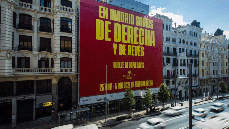 La Copa Davis ha empezado a promocionarse en Madrid con una llamativa lona de 500 metros cuadrados instalada en un edificio de la Gran Vía en la que se reivindica que la capital española, una de las tres sedes de la competición que se disputará en noviembre, es "de derecha y de revés".