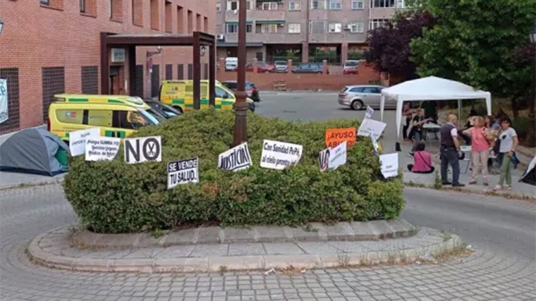 Un grupo de vecinos continúa acampado frente al Centro de Salud de Los Ángeles, en Villaverde, para reclamar al Gobierno regional la reapertura de los 37 Servicios de Urgencias de Atención Primaria (SUAP) de la región y en defensa de la Sanidad Pública.