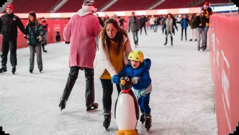 Con 4.200 m2 de hielo y capacidad para 1.500 patinadores simultáneos, la experiencia combina diversión sobre el hielo con música en vivo, sesiones de DJ, actividades para toda la familia y puestos de gastronomía típica navideña