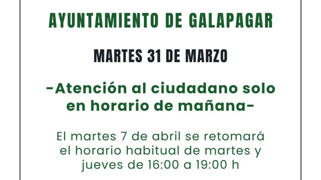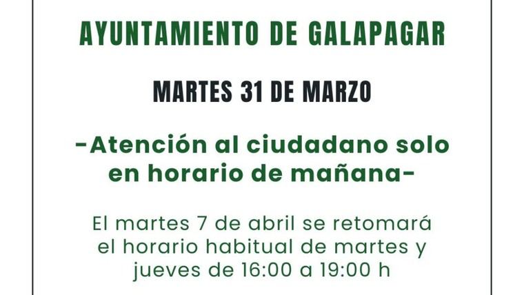El Ayuntamiento de Galapagar ha anunciado cambios en los horarios de atención al ciudadano con motivo de la Semana Santa. El martes 31 de marzo, la atención se limitará a la mañana, reanudándose el horario habitual de 16:00 a 19:00 horas el martes 7 de abril. Además, los días festivos del 2 y 3 de abril no habrá atención al público, y la Biblioteca permanecerá cerrada también el sábado 4 de abril. La recogida de residuos se suspenderá en los días festivos, mientras que el Punto Limpio tendrá un horario reducido. Para más detalles, visita el enlace.
