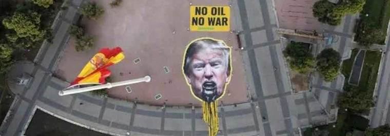 Activistas de Greenpeace han desplegado este jueves en el suelo de la Plaza de Colón de Madrid una imagen gigante de Donald Trump vomitando petróleo sobre una fuente teñida de negro junto al mensaje en inglés 'No oil, no war' ('No petróleo, no guerra'). La pancarta desplegada mide 15,5 metros de ancho por 40 metros de alto.