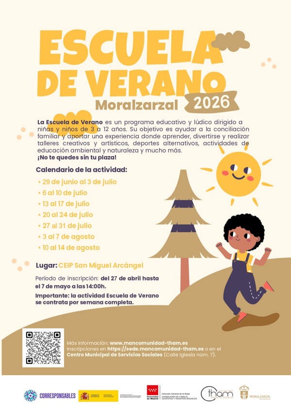 El Ayuntamiento de Moralzarzal, en colaboración con la Mancomunidad de Servicios Sociales THAM, lanza la Escuela de Verano 2026 para niños de 3 a 12 años. Este programa se llevará a cabo del 29 de junio al 14 de agosto en el CEIP San Miguel Arcángel, ofreciendo actividades educativas y recreativas que facilitan la conciliación familiar. Las inscripciones están abiertas del 27 de abril al 7 de mayo, priorizando situaciones de especial protección. Se ofrecen diferentes horarios y precios, con opciones que incluyen servicio de comedor. Para más información y detalles sobre la inscripción, visita el enlace.